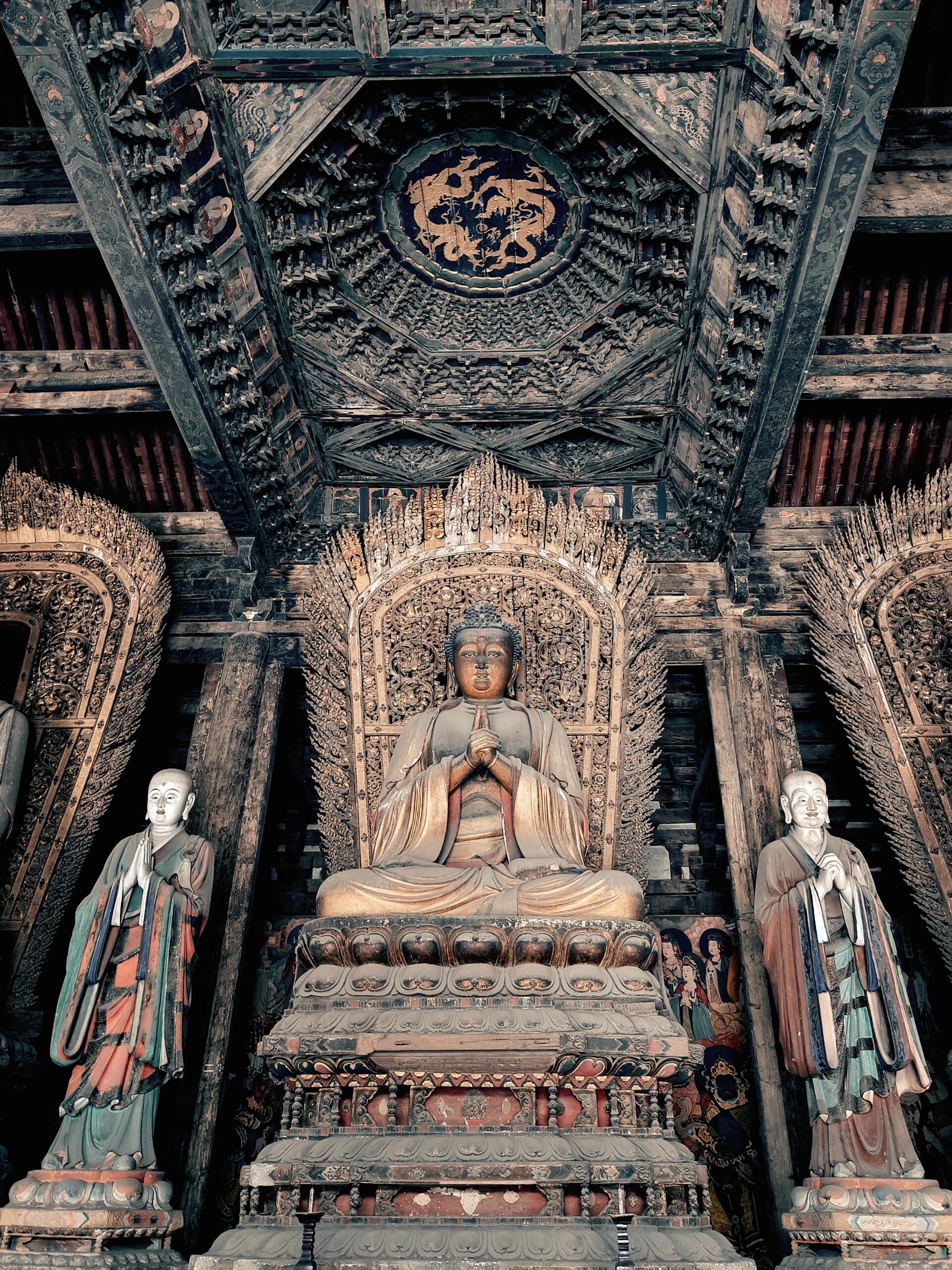 The temple complex consists of several main structures, including the Grand Hall, Three Saints Hall, and Bell Tower. The Grand Hall, the centerpiece of the temple, houses statues of Sakyamuni Buddha and other deities, crafted with meticulous detail. Its wooden beams and intricate carvings demonstrate advanced architectural techniques of the time.