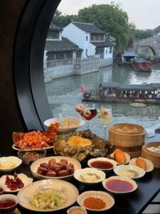 For lunch, head to Taihu Lake (太湖), a place famous for its fresh seafood. In autumn, try the Yangcheng Lake hairy crabs (阳澄湖大闸蟹), a local delicacy. You should also try the steamed white fish (清蒸白鱼), a light and flavorful dish popular in the Taihu Lake region. Dining by the lake offers a peaceful and scenic atmosphere.