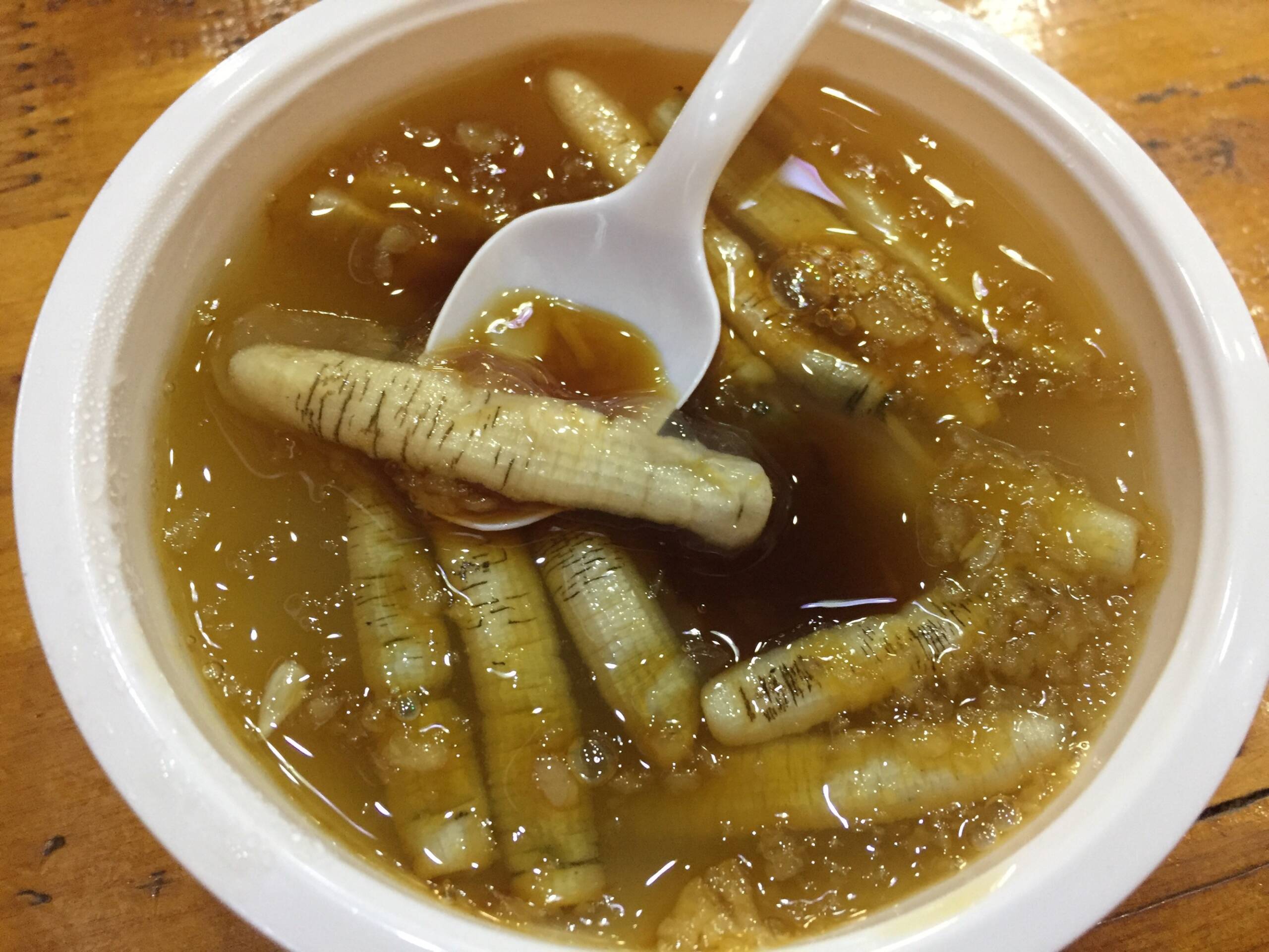 This jelly-like delicacy is made from sand-worms, which are boiled to extract their natural gelatin. Once cooled, the liquid solidifies into a transparent jelly. The dish is light and fresh in taste, often served with soy sauce, vinegar, sweet sauce, chili sauce, mustard, garlic paste, and toppings such as seaweed, shredded radish, and tomato slices. It is a unique and flavorful local snack.
