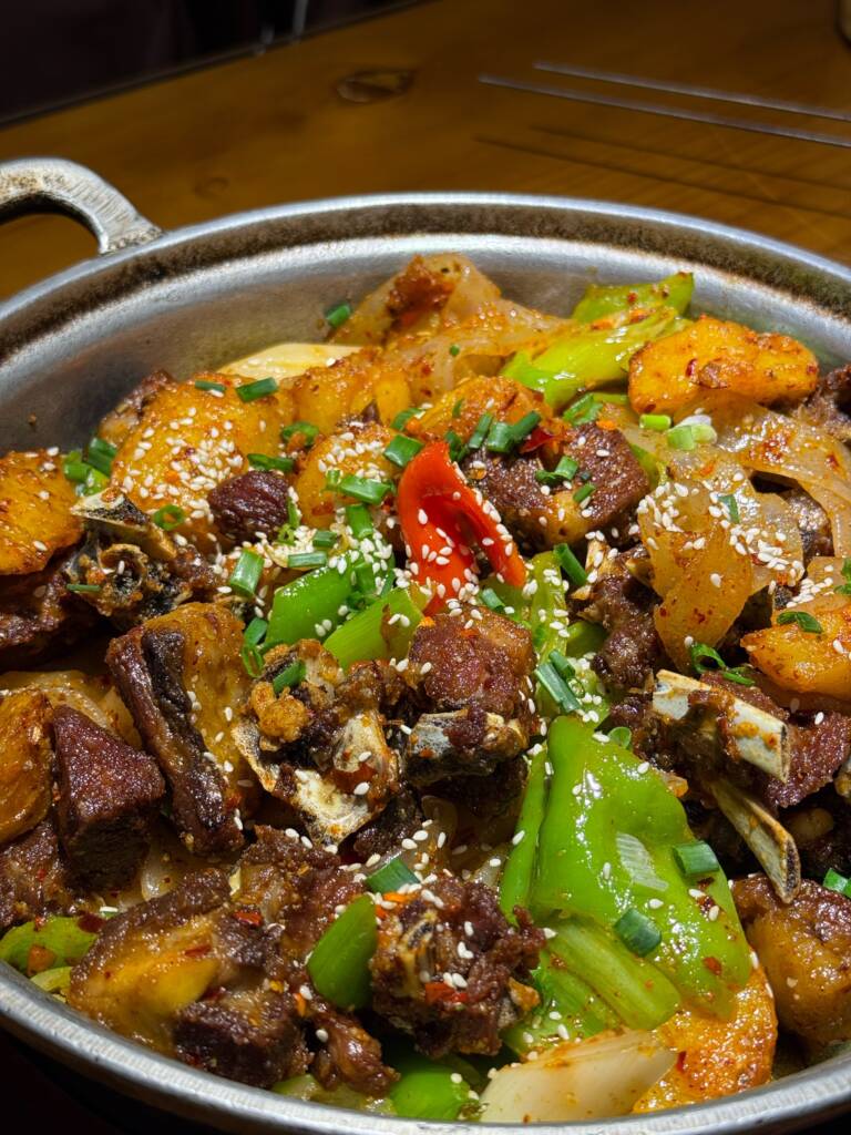 Kang Guo Lamb, or “roasted pot lamb,” is a hearty and beloved local specialty in Xining. Traditionally cooked in a large iron pan over an open flame or heated brick stove, this dish delivers bold flavor and rustic charm. Chunks of lamb, including both meat and bone, are first seared to lock in juices, then simmered with onions, garlic, dried chilies, and sometimes with potatoes or carrots.