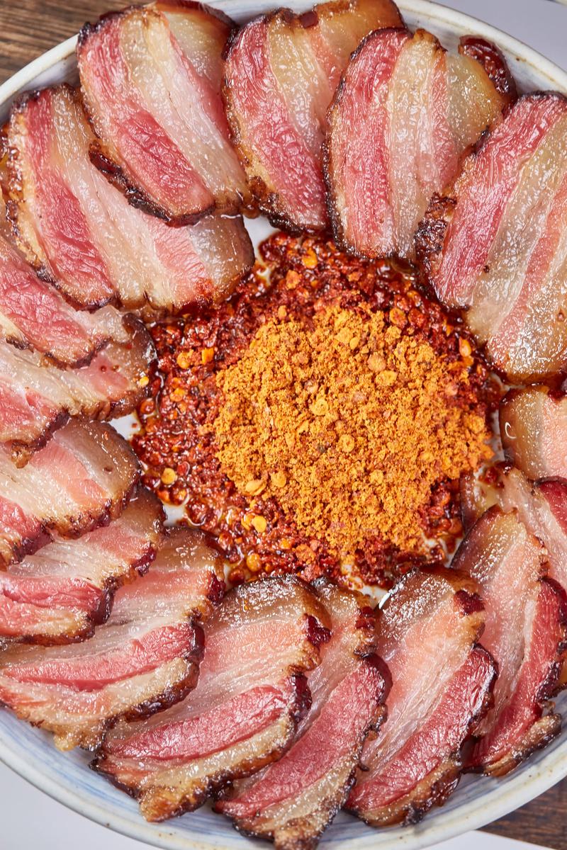 Zhangjiajie’s smoked cured meat is a local delicacy. Made from pork marinated in salt, chili, and spices, the meat is smoked over wood for days. This process gives it a rich, smoky flavor and chewy texture. La Rou is often stir-fried with vegetables or steamed, creating a comforting, homely dish.