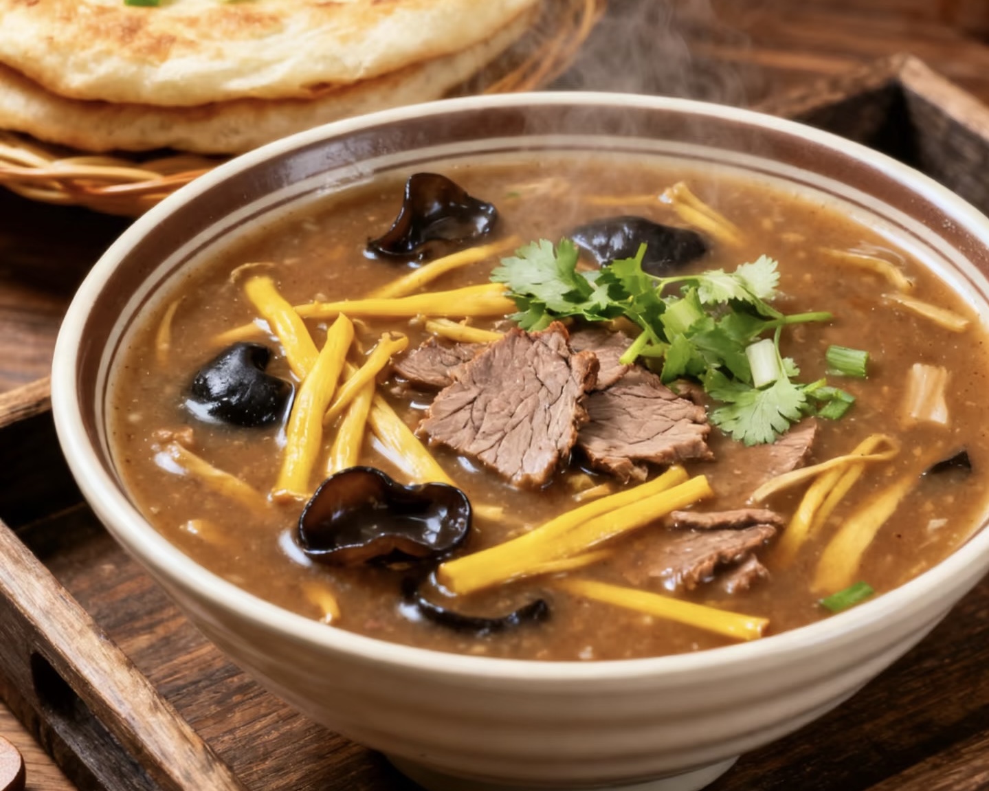Hu La Tang is a traditional Henan breakfast soup known for its bold, warming flavor. Made with beef broth, black pepper, chili, and a variety of ingredients such as tofu, gluten, peanuts, and vegetables, it has a thick, hearty texture. Despite its spicy reputation, the heat comes mainly from pepper rather than chili, creating a numbing warmth instead of sharp spiciness. Often paired with fried dough or flatbread, Hu La Tang is a favorite morning dish that energizes locals for the day ahead.